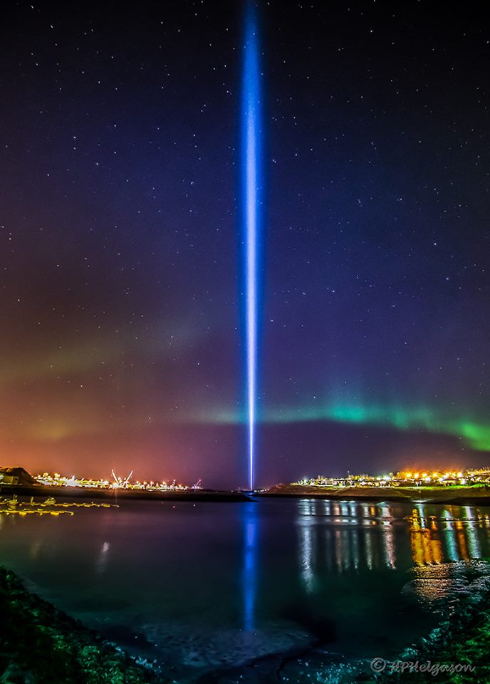 Each year from October 9 (John’s birthday) to December 8, lights from the Imagine Peace Tower shine into the skies above a small island in Iceland. From the website: