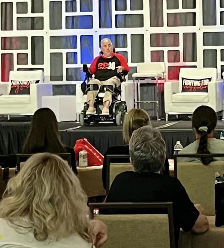 It’s ok, I sit around too (yuk yuk). But there was no idle movement last week. For the first time since my illness last winter, last week felt like the old me was back in the saddle again. Independent living for a bit and giving my daily support system (my wife) a well-deserved break from the tornado of my sophomoric humor and razor sharp wit. For those of you who might not know….I went to Florida with my best friend Jim Felker to attend and work at the 30th annual Parent Project Muscular Dystrophy conference. This year’s meeting was held in balmy Orlando where it rains daily in the sunshine state and you can feel and see the air. Who invented Florida in late June? No wonder why my wife didn’t want to go with me. I just thought she was tired of my jokes.